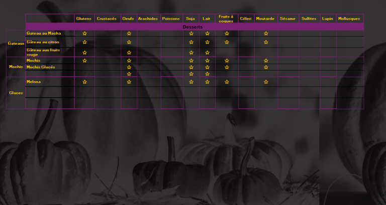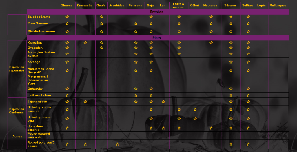 Afin de pouvoir vous attabler et déguster nos plats en toute sécuritée, voici la liste de nos plats avec les allergènes qu'ils contiennent
